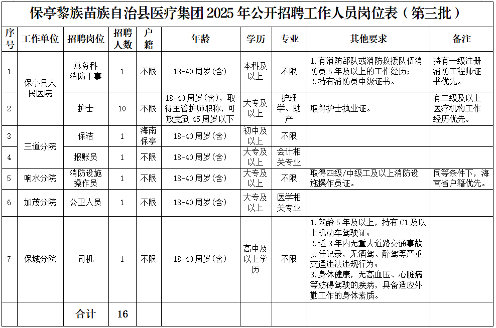 保亭黎族苗族自治县医疗集团2025年公开招聘工作人员(第三批)公告(第1号)