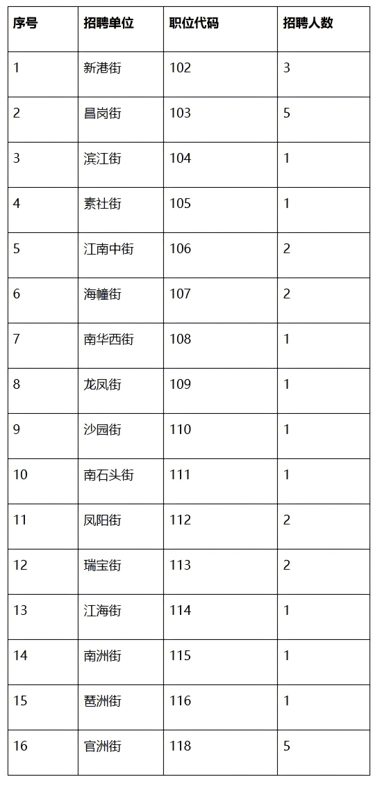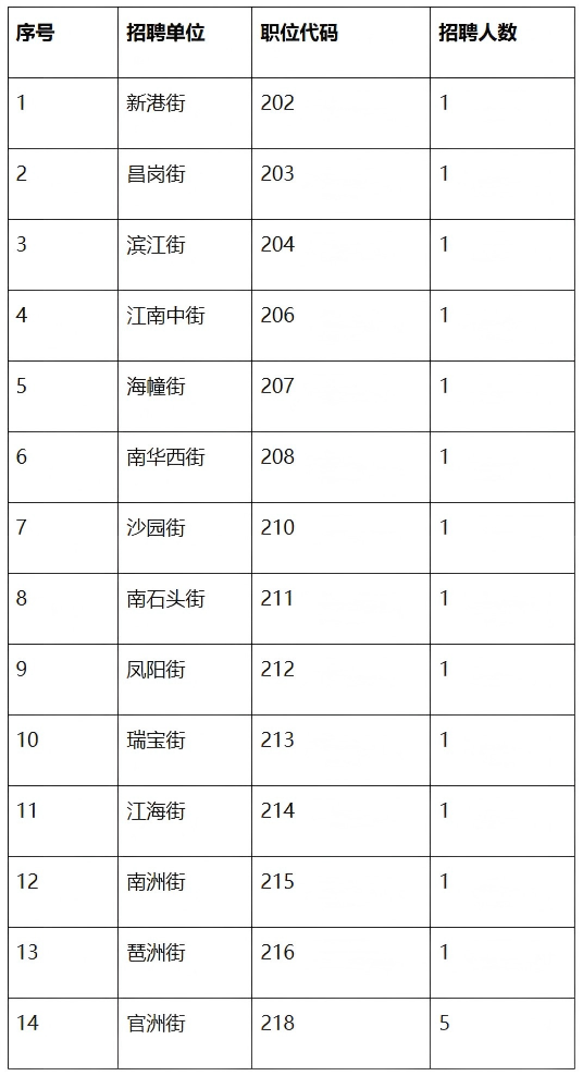 注:每个报考人员只能报考一个单位的其中一个岗位。 四、招聘程序和办法 (一)报名及资格审查 1.报名方式:本次招聘只接受网上报名,考生登录报名系统(https://www.sydwzk.cn/gdxbnhzqsgzp2025),按照网上提示方法填写个人资料进行报名。网上报名时应按照报名系统要求认真填写相关资料,考生需下载填写《2025年海珠区社区专职工作人员公开招聘报名登记表》(详见附件1)并亲笔签名上传报名系统。未按规定填写的,造成审核不通过或者其他问题的,责任由考生自负。报考人员提供的涉及报考资格的材料或信息不实的,取消本次报考资格。践行诚信报考,报考人员或其他人员恶意报名、攻击报名系统的,将按照公开招聘违纪违规有关规定处理,涉嫌犯罪的,移送司法机关处理。 2.报名时间:2025年12月10日(星期三)9:00至12月14日(星期日)17:00。报名前两日考生可在系统查看各岗位报名情况,报名系统技术问题请咨询400-822-8076。 3.资格初审:笔试前由人工通过报考人员上传的资料对个人信息的真实性、资格条件进行初步审查,如遇审核不通过,系统会短信通知考生补充资料,补充资料截止时间为2025年12月16日(星期二)16:00,未在规定时间内按要求完成资料补充的,视为报名不成功。 4.网上确认:系统初审成功的报考人员,须登录报名系统进行网上确认。未在规定时间内按要求完成网上确认的,视为放弃考试资格,具体确认时间请留意海珠区人民政府门户网站后续公告或登录报名系统查看。 5.准考证打印:网上确认成功的考生,应自行登录报名系统下载和打印准考证。未在规定时间内打印准考证的,视为放弃考试资格,具体打印准考证时间请留意海珠区人民政府门户网站后续公告或登录报名系统查看。 (二)笔试安排 1.笔试时间:具体笔试时间、考点和笔试要求以笔试准考证为准。 2.笔试内容分公共知识和专业知识两部分。公共知识部分包括党的基本知识、时事政治、法律常识等。专业知识部分包括党务、社区治理、民政、劳动保障等与社区居委会工作相关的知识。 3.笔试成绩满分100分,按照四舍五入原则保留小数点后两位。考试不指定参考用书。依笔试成绩高低,按招聘职位拟招聘人数1:5的比例确定进入面试的人员名单,未达到1:5比例的全部进入面试。如遇入围笔试成绩最后一名并列的,则一并列入面试。 4.笔试成绩可于笔试结束7个工作日后在报名网站查询。 (三)资格复审 面试前须进行资格复审。按笔试成绩由高到低的顺序,按照聘用人数1∶5的比例确定进入资格复审人员。 1.资格审查时间:进入面试人员进行资格审查,以资格审查通知为准。 2.资格审查材料: 社区专职工作人员A岗:《2025年海珠区社区专职工作人员公开招聘报名登记表》(报考人员自行登录报名网址下载) 本人近期大一寸免冠正面彩照、本人有效身份证、户籍证明或居住证明、学历证、学位证、学信网学历验证、退役军人应提供退役军人相关证书,非广州市户籍考生还应提供居住证或居住证办理窗口打印的《广州市来穗流动人口基本情况查询打印表》等电子档文件。 社区专职工作人员B岗:《2025年海珠区社区专职工作人员公开招聘报名登记表》(报考人员自行登录报名网址下载)、本人近期大一寸免冠正面彩照、本人有效身份证、学历证、学位证、学历鉴定证书、现用人单位出具海珠区街道协管员身份、工作经验证明、专职网格员身份证明及年度考核优秀证明。 报名者提交的材料应真实有效,凡弄虚作假的,一经查实,即取消考试资格或录用资格。 3.资格复审不合格、未按时参加资格复审或在资格复审结果公示之前表示放弃面试的,不得进入下一环节,所缺名额按笔试成绩排名顺序依次等额递补面试对象。 (四)面试安排 1.面试的时间、地点以《面试通知》为准。 2.面试主要考核应聘者的语言表达能力、综合分析能力、责任感与进取心、应变能力、仪表气质等方面的综合素质。 3.笔试成绩和面试成绩按4:6的比例计算考试总成绩。总成绩60分以上,按高低依次确定体检人选,若总成绩出现同分的,则按面试成绩由高分至低分排序。 (五)体检和考察 1.按用人单位拟聘用人数和考试总成绩高低顺序1:1的比例确定体检人选。参加体检人员须到指定医院进行体检,体检费自理。体检工作按照相关部门修订后的《公务员录用体检通用标准(试行)》《公务员录用体检操作手册(试行)》《公务员录用体检特殊标准(试行)》和《广东省公务员录用体检工作实施细则(试行)》组织实施。如不按要求体检或体检不合格者不予录取,所缺名额按考生总成绩排名顺序依次等额递补。根据《中华人民共和国劳动合同法》等法律法规规定,女性考生怀孕的,应在体检前主动向招考单位说明怀孕情况,并提供县级以上医院出具的怀孕医学证明,产后或终止妊娠后,由招聘单位组织补检。体检合格者进行考察。 2.考察工作严格按照广东省相关规定实施,各招聘单位具体组织考察。体检合格的考生进入组织考察环节,主要考察应试者的政治思想、道德品质、业务能力、工作实绩等。招聘单位可采取个别谈话、民主测评、查阅个人档案、同考察对象面谈,或由考察对象所在单位出具其一贯政治表现和业绩鉴定材料等形式进行,做到全面、客观、公正,确保拟聘用的社区专职工作人员具有良好的政治素质和工作能力。对考察不合格或放弃考察的,